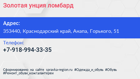 Золотая унция, ломбард по адресу 353440, Краснодарский край, Анапа, Горького, 51 в дальнейшем Организация, размещена в следующих категориях: