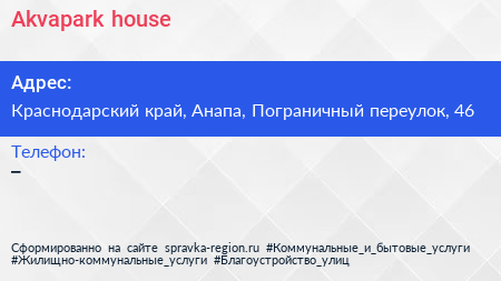 Akvapark-house по адресу Краснодарский край, Анапа, Пограничный переулок, 46 в дальнейшем Организация, размещена в следующих категориях: