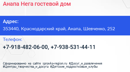 Анапа-Нега, гостевой дом по адресу 353440, Краснодарский край, Анапа, Шевченко, 252 в дальнейшем Организация, размещена в следующих категориях: