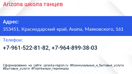 Arizona, школа танцев по адресу 353451, Краснодарский край, Анапа, Маяковского, 161 в дальнейшем Организация, размещена в следующих категориях: