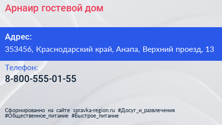 Арнаир, гостевой дом по адресу 353456, Краснодарский край, Анапа, Верхний проезд, 13 в дальнейшем Организация, размещена в следующих категориях: