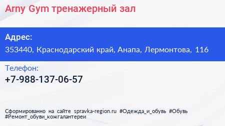 Arny Gym, тренажерный зал по адресу 353440, Краснодарский край, Анапа, Лермонтова, 116 в дальнейшем Организация, размещена в следующих категориях: