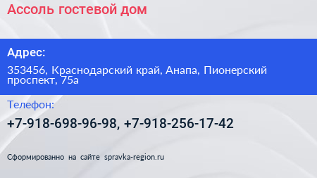 Ассоль, гостевой дом по адресу 353456, Краснодарский край, Анапа, Пионерский проспект, 75а в дальнейшем Организация, размещена в следующих категориях: