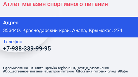 Атлет, магазин спортивного питания по адресу 353440, Краснодарский край, Анапа, Крымская, 274 в дальнейшем Организация, размещена в следующих категориях: