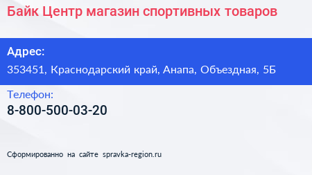 Байк Центр, магазин спортивных товаров по адресу 353451, Краснодарский край, Анапа, Объездная, 5Б в дальнейшем Организация, размещена в следующих категориях: