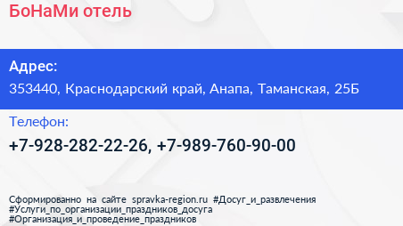 БоНаМи, отель по адресу 353440, Краснодарский край, Анапа, Таманская, 25Б в дальнейшем Организация, размещена в следующих категориях: