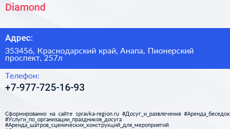 Diamond по адресу 353456, Краснодарский край, Анапа, Пионерский проспект, 257л в дальнейшем Организация, размещена в следующих категориях: