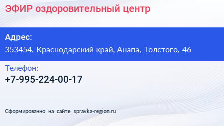 ЭФИР, оздоровительный центр по адресу 353454, Краснодарский край, Анапа, Толстого, 46 в дальнейшем Организация, размещена в следующих категориях: