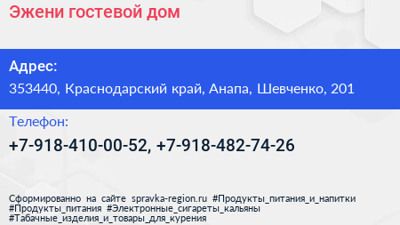 Эжени, гостевой дом по адресу 353440, Краснодарский край, Анапа, Шевченко, 201 в дальнейшем Организация, размещена в следующих категориях: