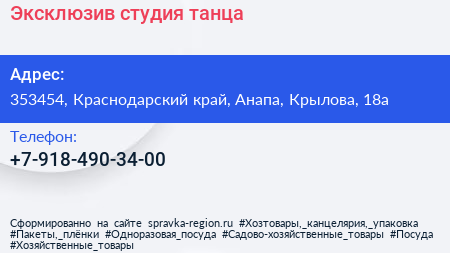 Эксклюзив, студия танца по адресу 353454, Краснодарский край, Анапа, Крылова, 18а в дальнейшем Организация, размещена в следующих категориях: