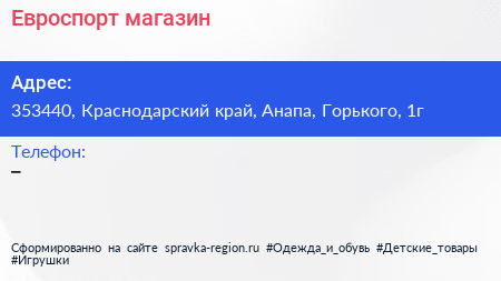 Евроспорт, магазин по адресу 353440, Краснодарский край, Анапа, Горького, 1г в дальнейшем Организация, размещена в следующих категориях: