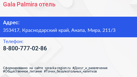 Gala Palmira, отель по адресу 353417, Краснодарский край, Анапа, Мира, 211/3 в дальнейшем Организация, размещена в следующих категориях: