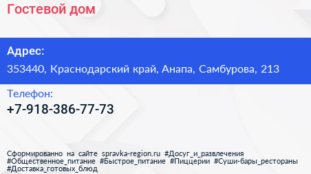 Гостевой дом по адресу 353440, Краснодарский край, Анапа, Самбурова, 213 в дальнейшем Организация, размещена в следующих категориях: