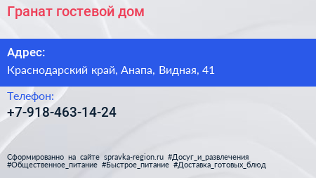 Гранат, гостевой дом по адресу Краснодарский край, Анапа, Видная, 41 в дальнейшем Организация, размещена в следующих категориях: