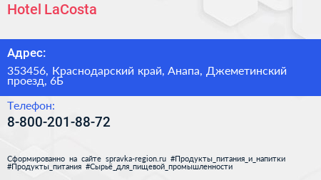 Hotel LaCosta по адресу 353456, Краснодарский край, Анапа, Джеметинский проезд, 6Б в дальнейшем Организация, размещена в следующих категориях: