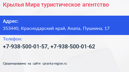 Крылья Мира, туристическое агентство по адресу 353440, Краснодарский край, Анапа, Пушкина, 17 в дальнейшем Организация, размещена в следующих категориях: