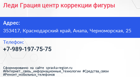 Леди Грация, центр коррекции фигуры по адресу 353417, Краснодарский край, Анапа, Черноморская, 25 в дальнейшем Организация, размещена в следующих категориях: