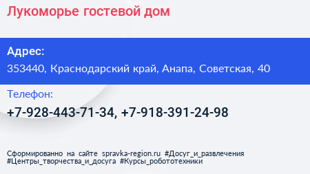 Лукоморье, гостевой дом по адресу 353440, Краснодарский край, Анапа, Советская, 40 в дальнейшем Организация, размещена в следующих категориях: