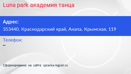 Luna park, академия танца по адресу 353440, Краснодарский край, Анапа, Крымская, 119 в дальнейшем Организация, размещена в следующих категориях: