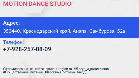 MOTION DANCE STUDIO по адресу 353440, Краснодарский край, Анапа, Самбурова, 52а в дальнейшем Организация, размещена в следующих категориях: