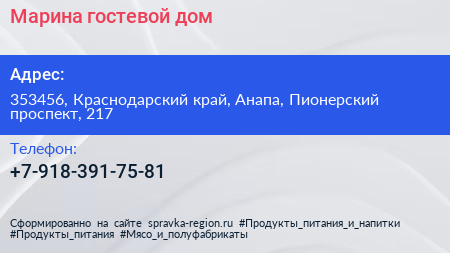 Марина, гостевой дом по адресу 353456, Краснодарский край, Анапа, Пионерский проспект, 217 в дальнейшем Организация, размещена в следующих категориях: