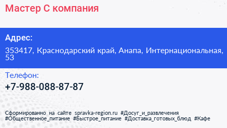 Мастер-С, компания по адресу 353417, Краснодарский край, Анапа, Интернациональная, 53 в дальнейшем Организация, размещена в следующих категориях: