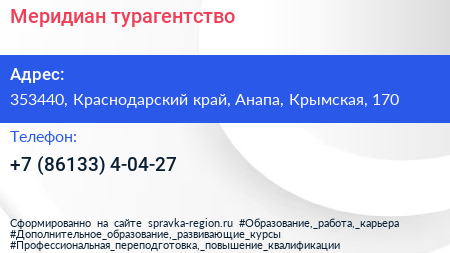 Меридиан, турагентство по адресу 353440, Краснодарский край, Анапа, Крымская, 170 в дальнейшем Организация, размещена в следующих категориях: