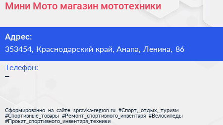 Мини-Мото, магазин мототехники по адресу 353454, Краснодарский край, Анапа, Ленина, 86 в дальнейшем Организация, размещена в следующих категориях:
