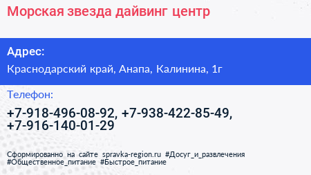 Морская звезда, дайвинг-центр по адресу Краснодарский край, Анапа, Калинина, 1г в дальнейшем Организация, размещена в следующих категориях: