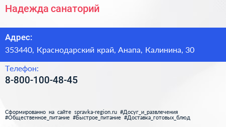 Надежда, санаторий по адресу 353440, Краснодарский край, Анапа, Калинина, 30 в дальнейшем Организация, размещена в следующих категориях: