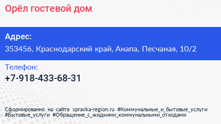 Орёл, гостевой дом по адресу 353456, Краснодарский край, Анапа, Песчаная, 10/2 в дальнейшем Организация, размещена в следующих категориях: