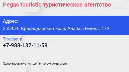 Pegas touristic, туристическое агентство по адресу 353454, Краснодарский край, Анапа, Ленина, 179 в дальнейшем Организация, размещена в следующих категориях: