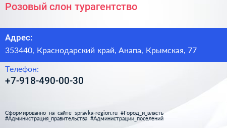Розовый слон, турагентство по адресу 353440, Краснодарский край, Анапа, Крымская, 77 в дальнейшем Организация, размещена в следующих категориях: