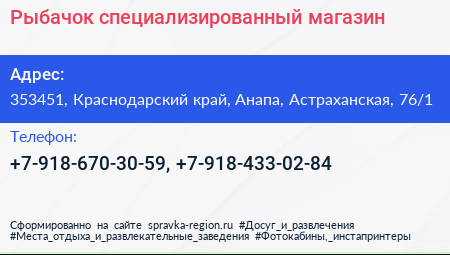 Рыбачок, специализированный магазин по адресу 353451, Краснодарский край, Анапа, Астраханская, 76/1 в дальнейшем Организация, размещена в следующих категориях: