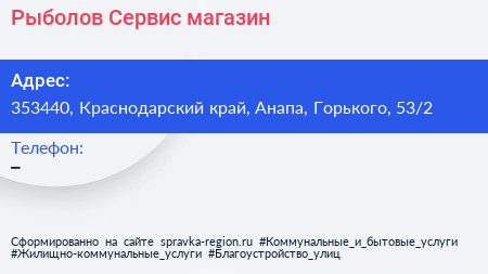 Рыболов Сервис, магазин по адресу 353440, Краснодарский край, Анапа, Горького, 53/2 в дальнейшем Организация, размещена в следующих категориях: