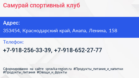 Самурай, спортивный клуб по адресу 353454, Краснодарский край, Анапа, Ленина, 158 в дальнейшем Организация, размещена в следующих категориях: