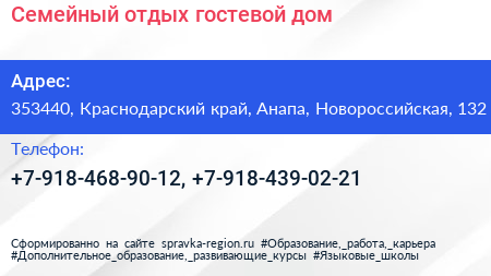 Семейный отдых, гостевой дом по адресу 353440, Краснодарский край, Анапа, Новороссийская, 132 в дальнейшем Организация, размещена в следующих категориях: