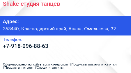 Shake, студия танцев по адресу 353440, Краснодарский край, Анапа, Омелькова, 32 в дальнейшем Организация, размещена в следующих категориях:
