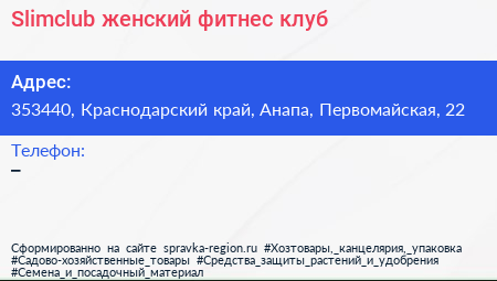 Slimclub, женский фитнес-клуб по адресу 353440, Краснодарский край, Анапа, Первомайская, 22 в дальнейшем Организация, размещена в следующих категориях: