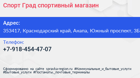 Спорт Град, спортивный магазин по адресу 353417, Краснодарский край, Анапа, Южный проспект, 3Б в дальнейшем Организация, размещена в следующих категориях: