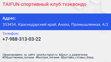 TAIFUN, спортивный клуб тхэквондо по адресу 353454, Краснодарский край, Анапа, Промышленная, 4/2 в дальнейшем Организация, размещена в следующих категориях: