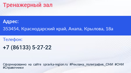 Тренажерный зал по адресу 353454, Краснодарский край, Анапа, Крылова, 18а в дальнейшем Организация, размещена в следующих категориях: