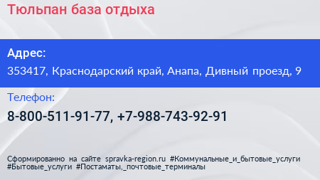 Тюльпан, база отдыха по адресу 353417, Краснодарский край, Анапа, Дивный проезд, 9 в дальнейшем Организация, размещена в следующих категориях: