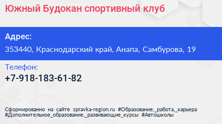 Южный Будокан, спортивный клуб по адресу 353440, Краснодарский край, Анапа, Самбурова, 19 в дальнейшем Организация, размещена в следующих категориях: