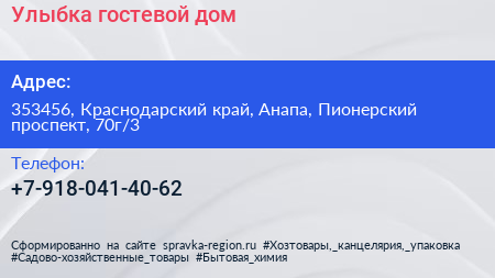 Улыбка, гостевой дом по адресу 353456, Краснодарский край, Анапа, Пионерский проспект, 70г/3 в дальнейшем Организация, размещена в следующих категориях:
