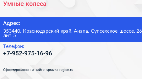 Умные колеса по адресу 353440, Краснодарский край, Анапа, Супсехское шоссе, 26 лит 5 в дальнейшем Организация, размещена в следующих категориях: