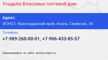 Усадьба Власовых, гостевой дом по адресу 353417, Краснодарский край, Анапа, Скифская, 36 в дальнейшем Организация, размещена в следующих категориях: