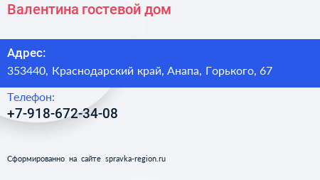 Валентина, гостевой дом по адресу 353440, Краснодарский край, Анапа, Горького, 67 в дальнейшем Организация, размещена в следующих категориях: