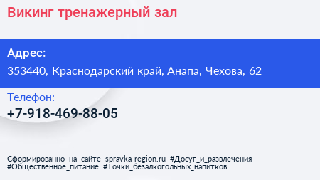 Викинг, тренажерный зал по адресу 353440, Краснодарский край, Анапа, Чехова, 62 в дальнейшем Организация, размещена в следующих категориях: