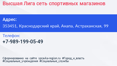 Высшая Лига, сеть спортивных магазинов по адресу 353451, Краснодарский край, Анапа, Астраханская, 99 в дальнейшем Организация, размещена в следующих категориях: